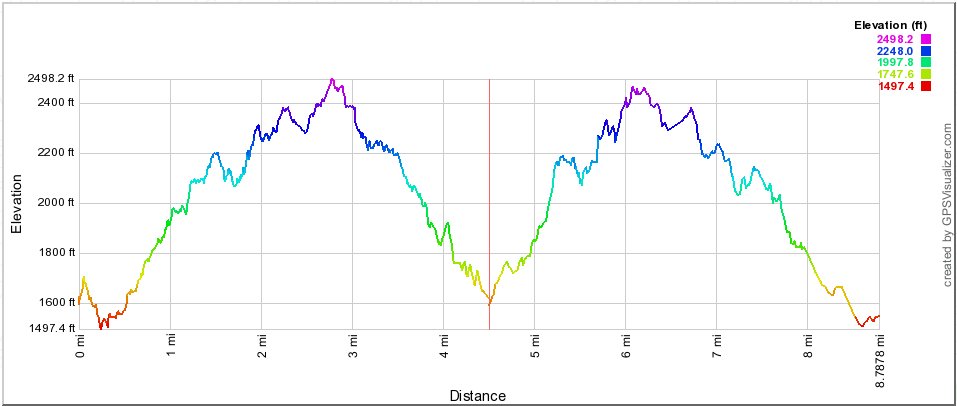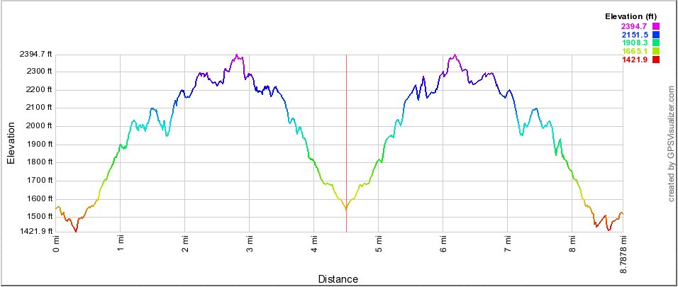 I was interested in comparing distance/elevation profiles for the two hikes. Here the 2012 hike, starting downhill, is on the left, and 2011 starting uphill is on the right. |