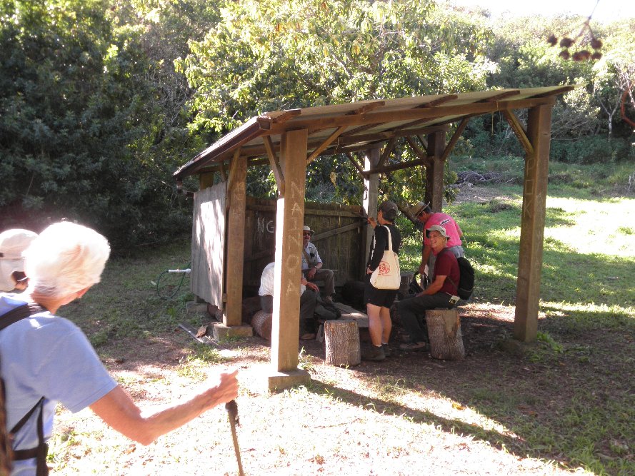 This is the shelter itself. One group would head left (east) on the Mokule`ia trail, and the other would head westward and do a loop back to the cars. (10:06)