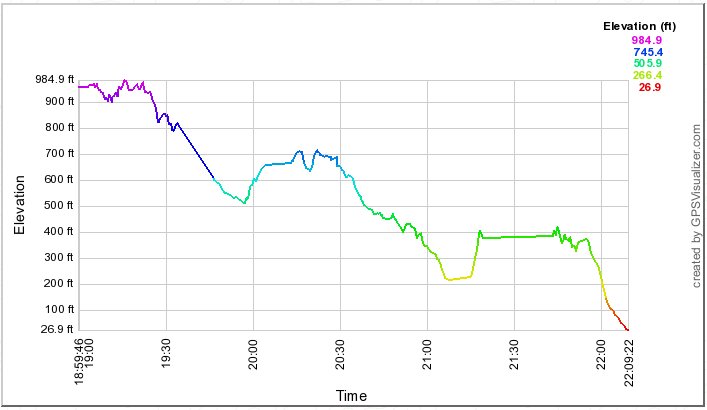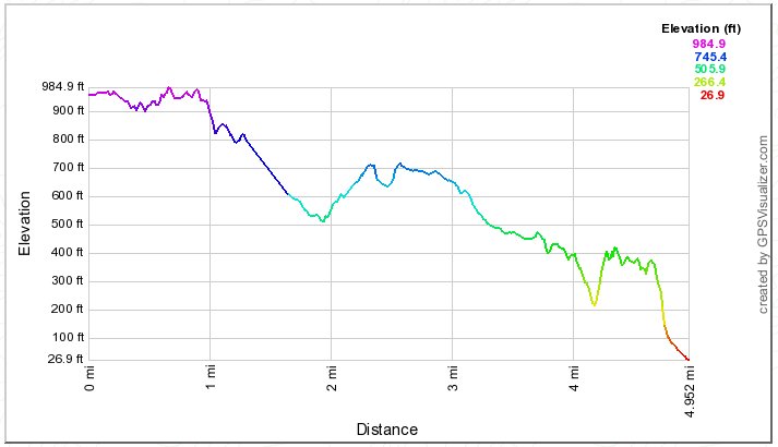 At least one other GPS got more than five miles out of this hike. The yellow dip after four miles on this profile