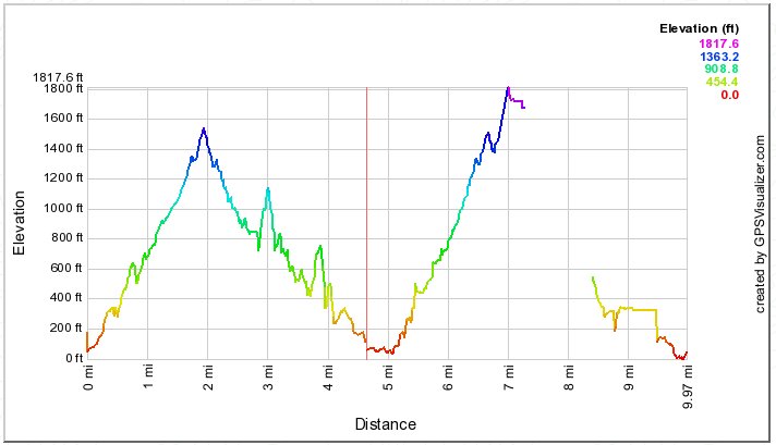 This shows the elevation profiles from two hikes, as if one were a continuation of the other. On the left, the 2010 version, where we stopped at what my Magellan thought was about 1500 feet to eat and turn back. The Magellan always comes out with a shorter hike length than most other GPSs do, so figure at least five miles. The next almost 5½ miles (think 6+) are from the 2009, longer and higher hike, with the long GPS gap. |