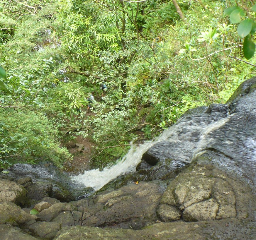 Looking down from the top of the first waterfall. At least three hikers can be spotted through the trees. Once