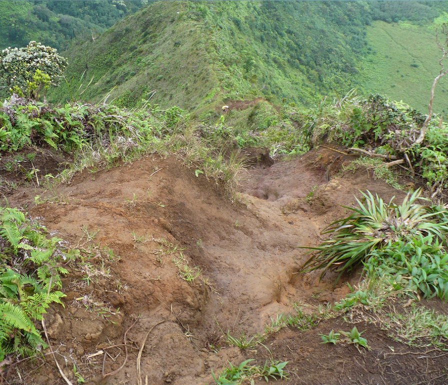 The cascade is now a distant memory, on the way to that intermediary peak. The floor of Ka`au Crater is partially seen to the right here.
