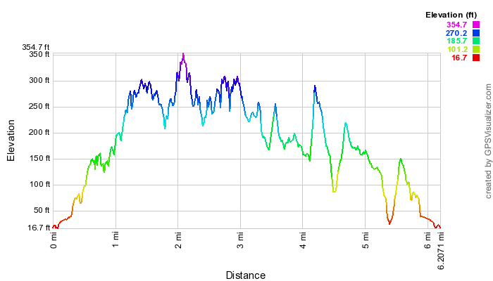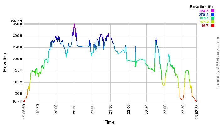 These profiles apply to the 2013-05-15 Kahana double loop hike. The time profile shows elevation vs time, but one must subtract 10 hours for Hawai`i time.