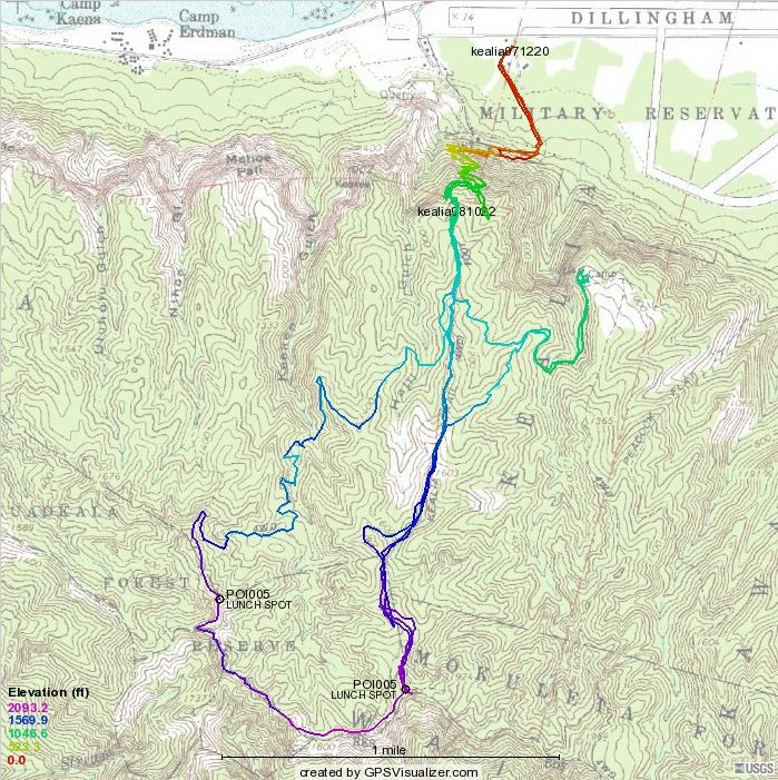 The route taken October 2009 is the shortest version that includes the two lunch spots (8.23 miles?), except for those who added a mile (half-mile in, half-mile out) down the northwest rim of Makua Valley. ![]() ![]() Kelvin's topo map |