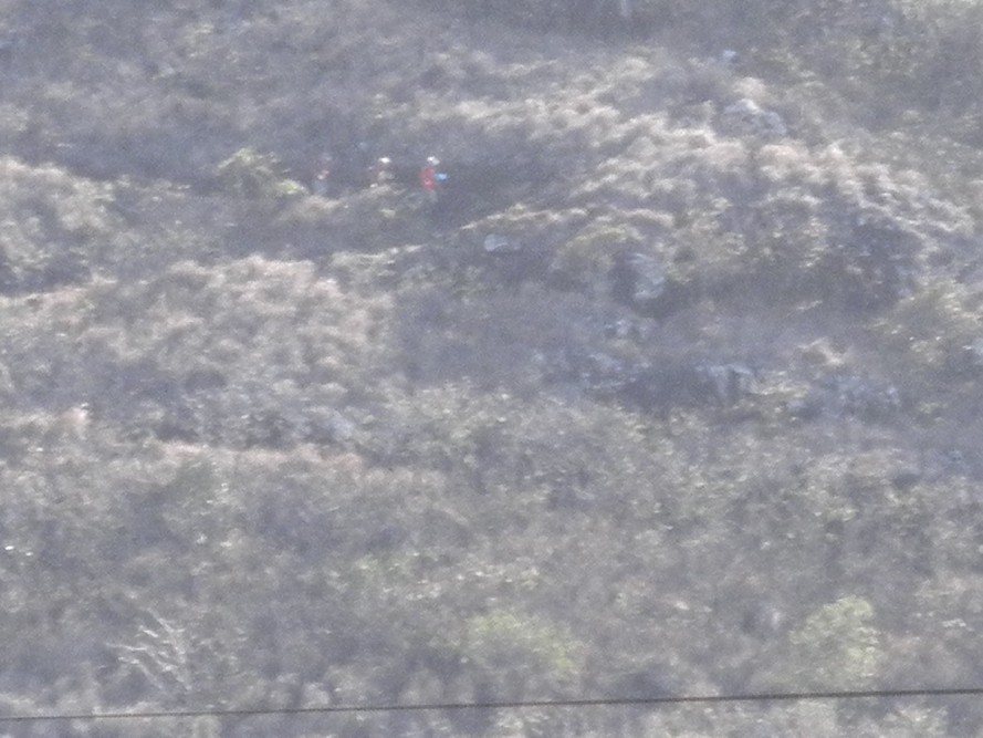 While waiting, we watched the switchbacks for hikers heading back. Here are three, fuzzy due to being in an unbraced zoom shot. I don't recognize them, and this was already 3:24, so didn't wait to see who they were.