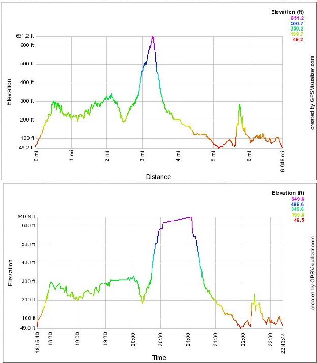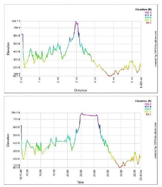 from about 10:30 (subtract 10 hours from chart times to get Hawaiian time) to 11:15. Here is a strange: the Bushnell does not record altitude or time info. It gets altitude from another source at GPSvisualizer.com, but I had to run the Magellan .log file along with the Bushnell to get the time chart! Presumably that is why the two Bushnell charts' elevations don't exactly agree. |