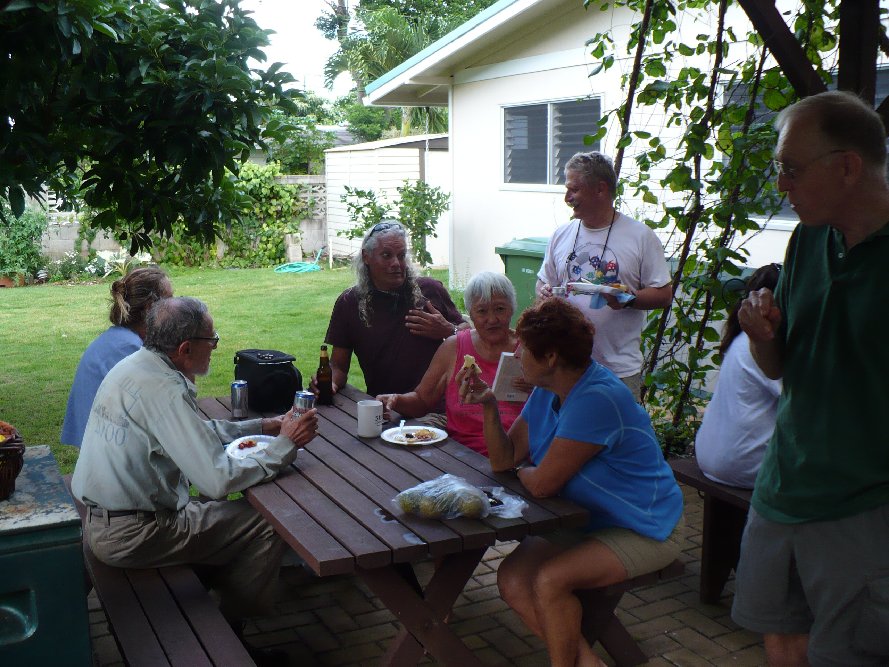 Living it up after the hike: John, Wolf's friend, Wolf, hostess Ruby, and ...I thought it was Carren, but I'm not so sure... at the table, Bob and Chet standing.