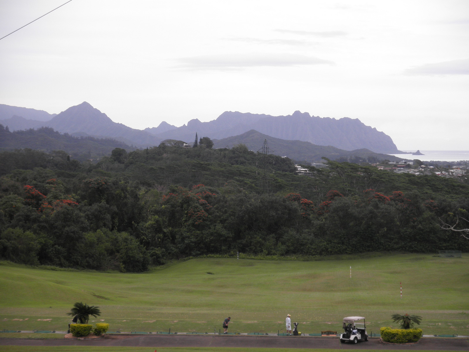 View from the golf course parking lot: Pu`u Ohulehule to Mokoli`i