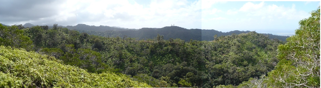 Panorama shot showing the easy part, except for wading through uluhe, of the way back. Someday I'll try to get pictures that really represent the way (way, way) down.