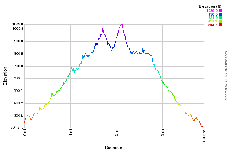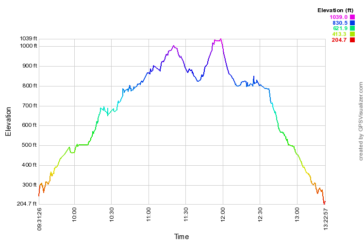 Like the map above, these profiles of the Niu Valley hike result from much editing of the .gpx file. It could use a lot more editing (resulting in a shorter distance calculation) but it gets to be more than I can handle. My new Magellan gets awfully confused in some places! (Well, even more so the old one; I can't have climbed Kūlepeamoa the way the green track shows!) |