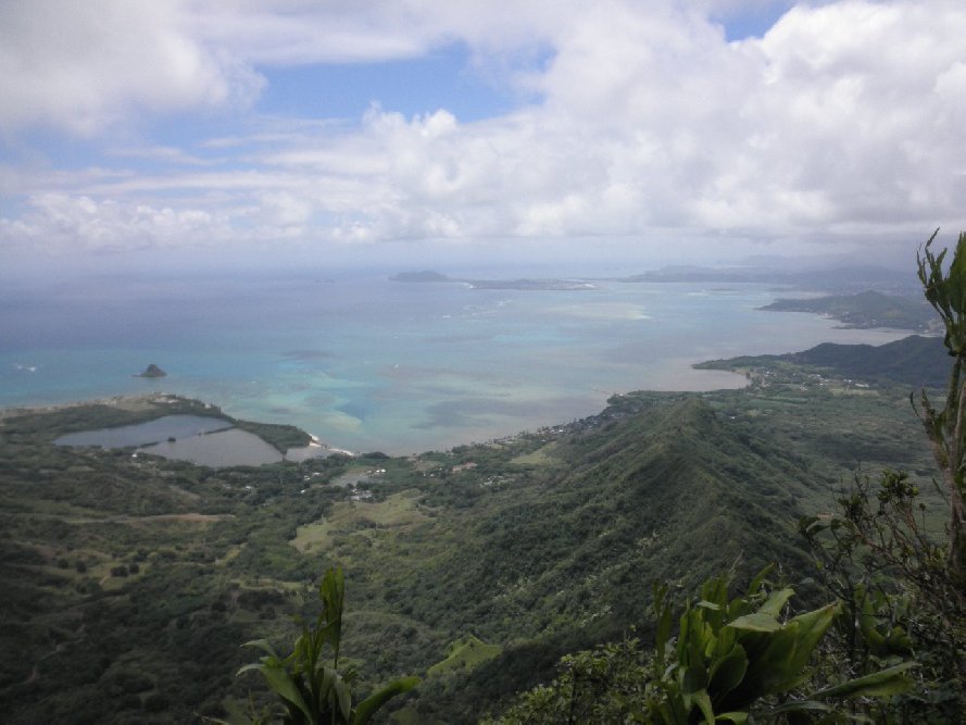 A view from the top, includes Mo`oli`i ("Chinaman's hat") just beyond the fish ponds and the Kāne`ohe Marine base top left center.