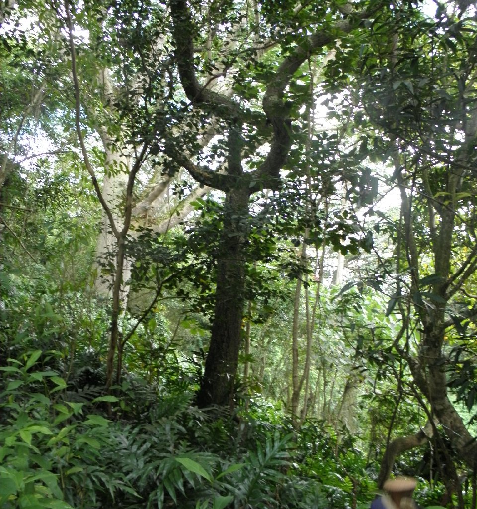 This cashew tree marks the spot where the trail from peak 858 on the Olomana Express hike crosses the trail down from the ridge