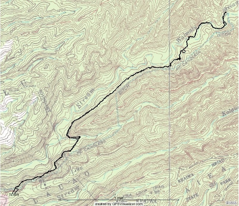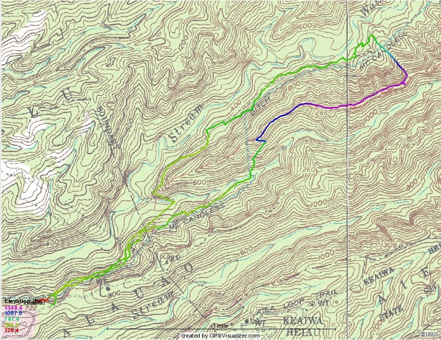 Above is a Magellan track of 2009's hike, the usual route taking the right fork along the contour to the waterfall, climbing