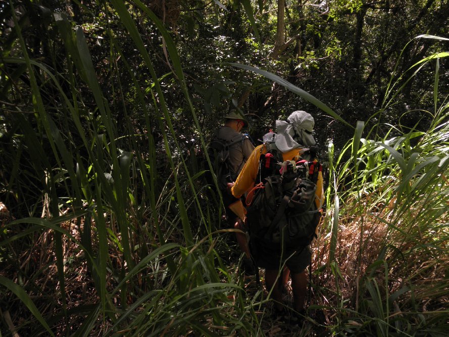 The trail was ribboned so that one had one high steep step down to the road, and hikers were waiting in line. Kelvin and I didn't feel like waiting, so we circled back to the way that comes down by the waterfall, a much gentler climb. I think the steep step was the way I got down when we first tried this hike; I remember how surprised I was, coming to a road. |