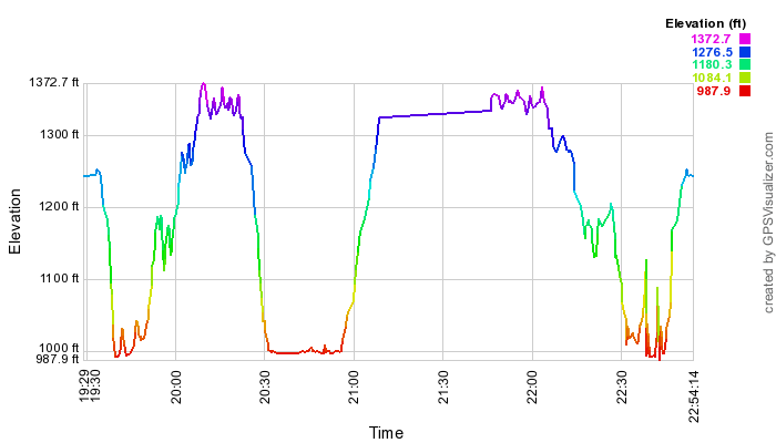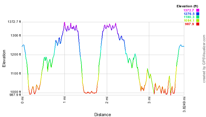 that year. I don't remember it clearly. The red track is from June 2012, counterclockwise to start but aborted at the first major stream crossing due to heavy current and unknown depth. This track was made with a Magellan Explorist 310, generally a better tracker than the older 500, but it got really lost at the first shallow stream crossing area, either on the way out, or the way back, or both. The red marker to the right marks the top of a steep down trail that I think might come out on the contour trail that was intended as the end of the loop part of the hike, after a second stream crossing that would probably also have been doubtful. Below, elevation by distance and elevation by time profiles for my 2012 hike. ![]() ![]() ![]() ![]() ![]() |