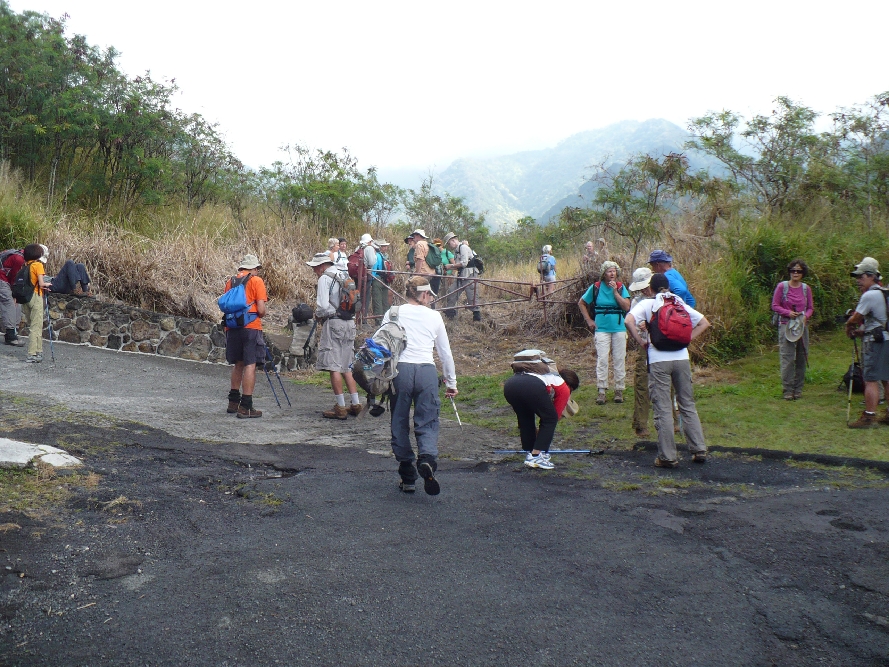 We begin gathering at the trailhead, our goal hidden in haze. Is that Lily, this side of Leonard who is talking with Erika? Karen near, and Carren in the distance!