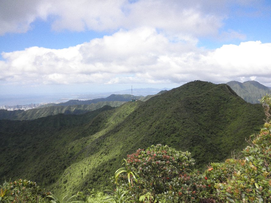 The hikers who took the prescribed route would go just beyond that TV transmission tower to a spot hidden by the foreground peak. One hiker, a faint white spot, is visible.