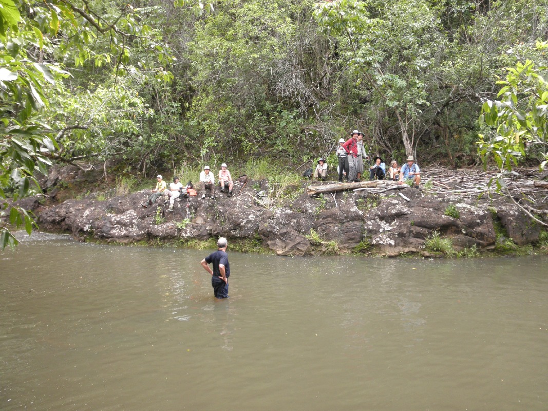 An alternate crossing #12 (counting downstream) gets one to the far side of this very swimmable pool. Tom had gotten pretty wet, so decided to enjoy the water. (Tom is also sitting on the bank, furthest to the right. How do you explain that?)