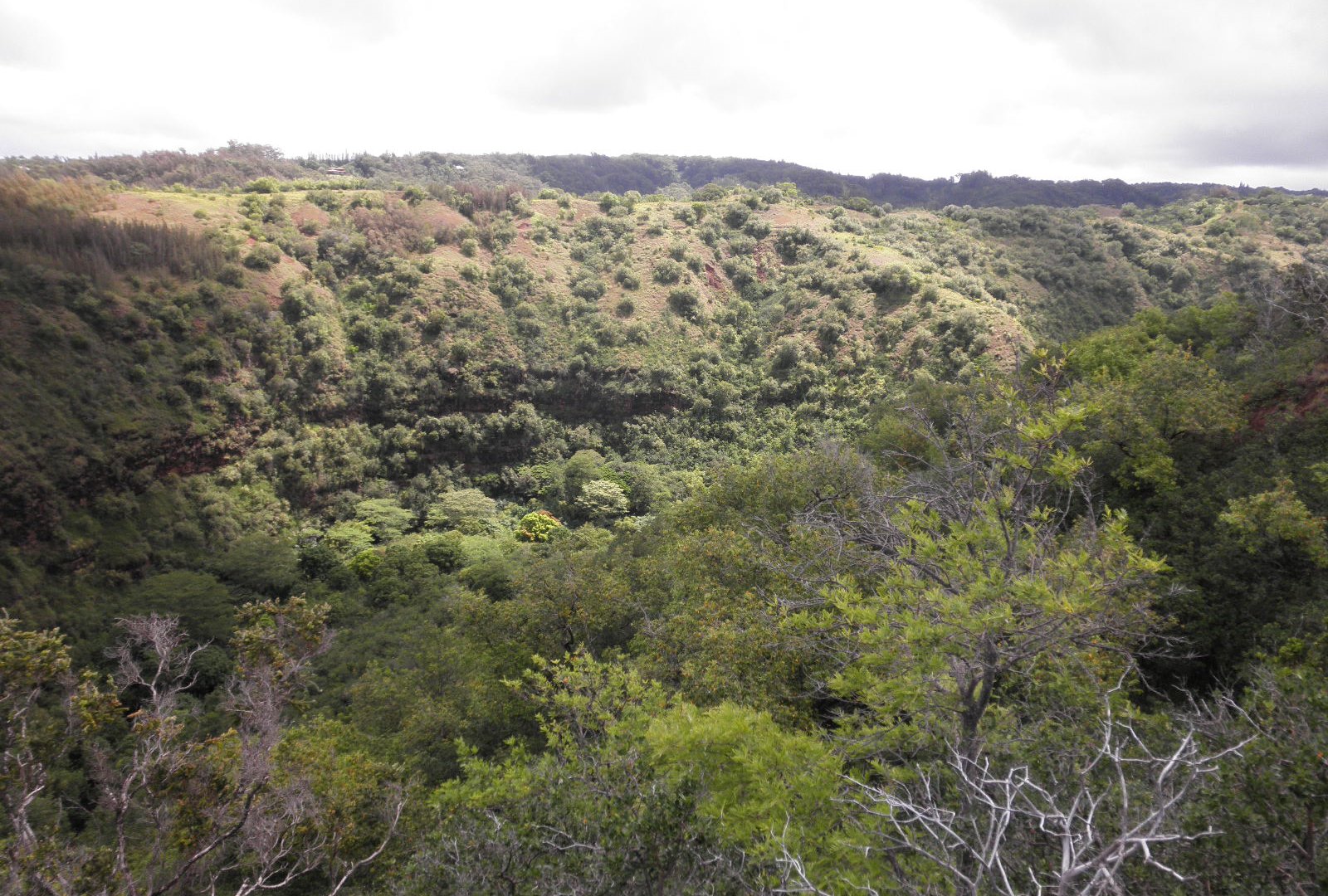 And this follows that ridge in the mauka direction. We would be climbing up to the ridge about the very right-hand side of the photo. Of interest (to me, anyway) is the contour road visible here and there below the ridge summit. I once followed it out from below the picnic table spot to where it rejoined the ridge road/trail. Maybe not allowable under current management?