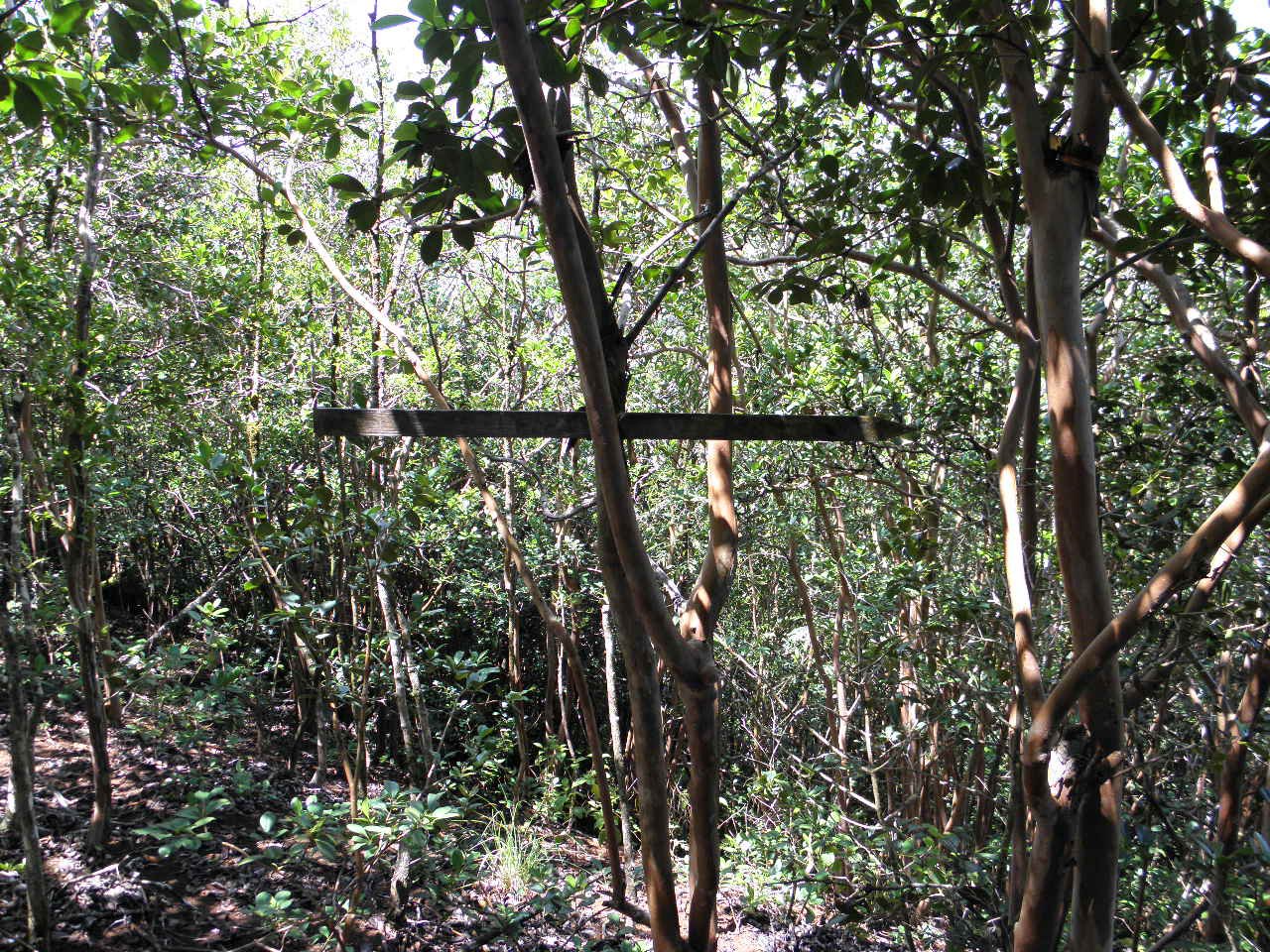but Kelvin figured it out and set me straight: It means we're going the wrong way (left). On June 8th, 2014, a group cleared this trail for a hike later in the month. The arrow was still pointing the "right way," as always. But on hike day, 17 days later, I was horrified to find nothng but traces of what it had been tied there with. Steve, the only one ahead of me on the hike, told me later that he had found a wooden arrow lying in the trail, and took it to mark the point we leave the trail to head down into the valley. Somehow I didn't see it there, and hung a dead branch across the trail for the same purpose. ![]() ![]() ![]() |