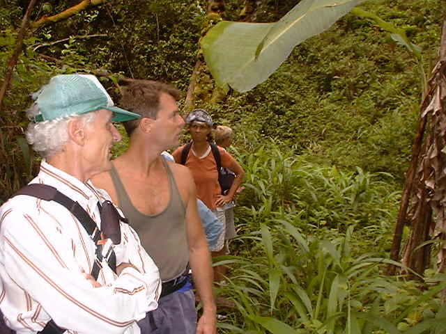 I did one semi-organized hike my first year here. One of my UH colleagues took us newbies on a hike up Moana Lua Valley, as far as the petroglyphs, at least, (and that day I had my first look--yucch!--and taste--ʻono!--inside a lilikoʻi) but it didn't seem like a real hike--I could see potential goals in the distance, but it wasn't until years later with the Solemates that I ever reached any of them. If "bike hikes" count, my daughters and I did an overnight ride with a few fellow members of the Hawaii Bicycling League along dirt roads from Wahiawā to Pūpūkea, then back on the roads to Wahiawā. And my last pre-Solemates hike, back sometime in the mid-80s, was up the Du Pont trail to the top of Mount Kaʻala, probably with the Sierra Club. My friend John Hall was the leader of that fairly easy hike [later addition here--where did I get that "fairly easy"? I did it again as my first hike as a member of Hawaiian Trail and Mountain Club, and some of it is downright tough!], but it was awfully rainy and cold at the top, in spite of the hot sunny weather going both up and down.